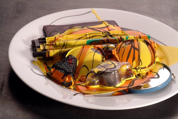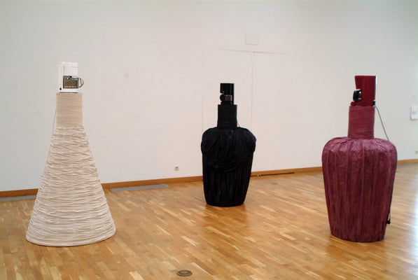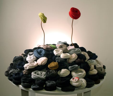 Efni, svo sem allskyns textill og hlutirnir sem verða fyrir valinu sem hráefni í verkin mín eru rúin fyrri tilgangi því ég er með önnur sambönd og nýjar fyrirætlanir á prjónunum um framtíðarhlutverk og útlit þeirra. Oft fer af stað ákveðinn spuni eða ferli meðan á vinnslunni fer fram og oft ræður efnið hvar numið er staðar.